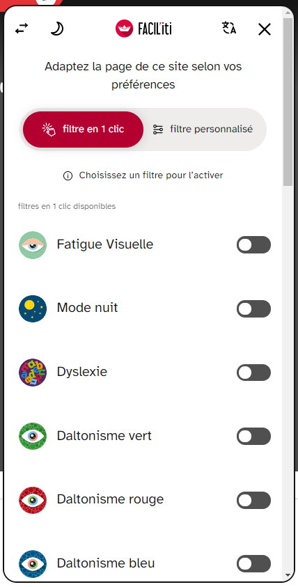 FACIL’iti est une solution d’accessibilité numérique innovante qui adapte en un clic les contenus et l’apparence du site pour favoriser l’accessibilité numérique à de nombreux types de handicaps (visuels, moteurs et cognitifs) ou pour améliorer le confort de lecture.